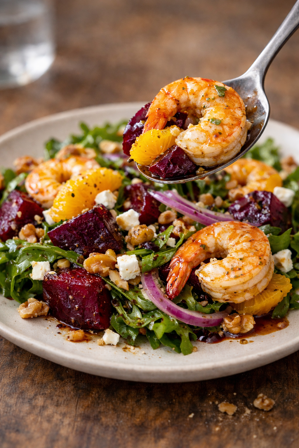 Beet salad with prawns, mixed greens, beets, oranges, red onion, walnuts, feta, and balsamic dressing.