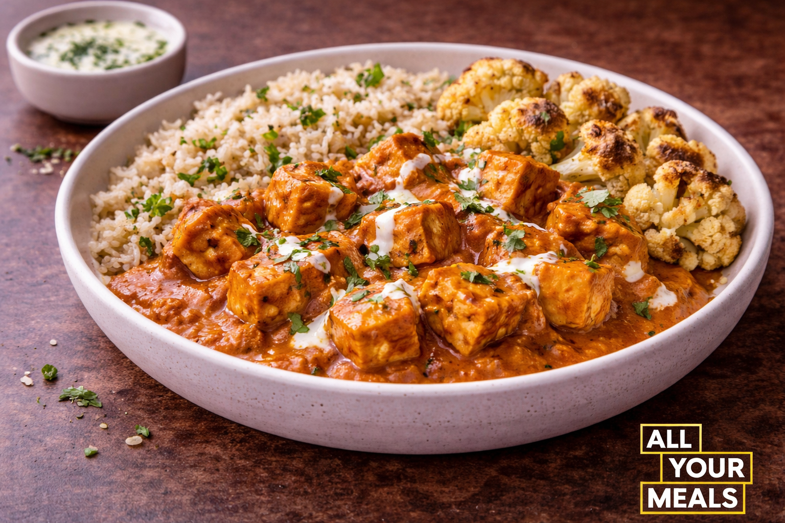 Vegetarian spin on an Indian classic! Spiced tofu with a fragrant butter curry sauce is served alongside turmeric roasted cauliflower, spiced potatoes and basmati rice pilaf.