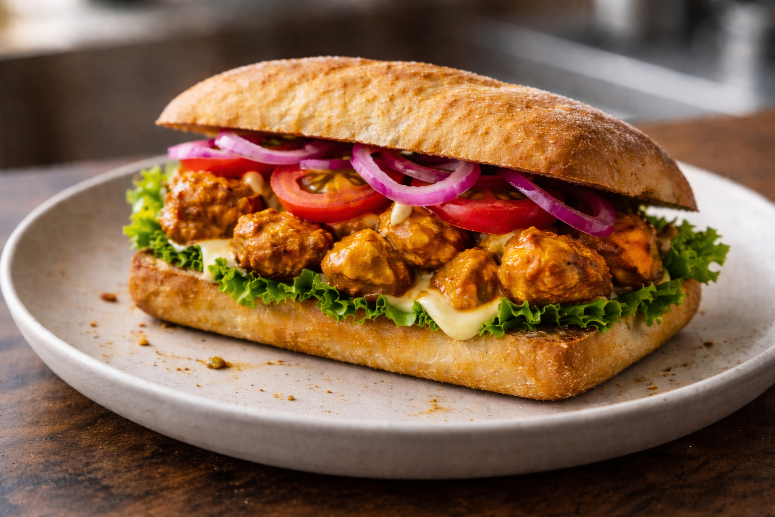 A delightful blend of East meets West; tender, spiced chicken tikka with fresh tomatoes, tangy pickled onions, and punchy lime aioli.