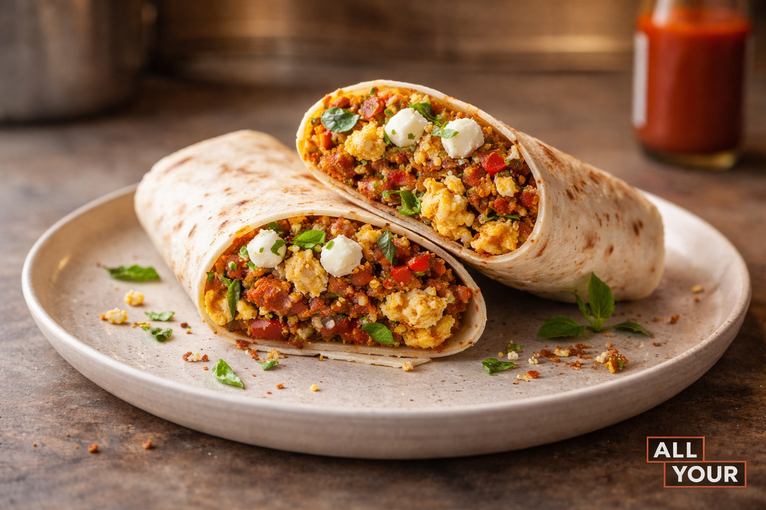 This chorizo breakfast wrap boasts a flavorful combination of scrambled egg, goat cheese, fresh basil and chorizo sausage for a hearty, nutritious start to your day.