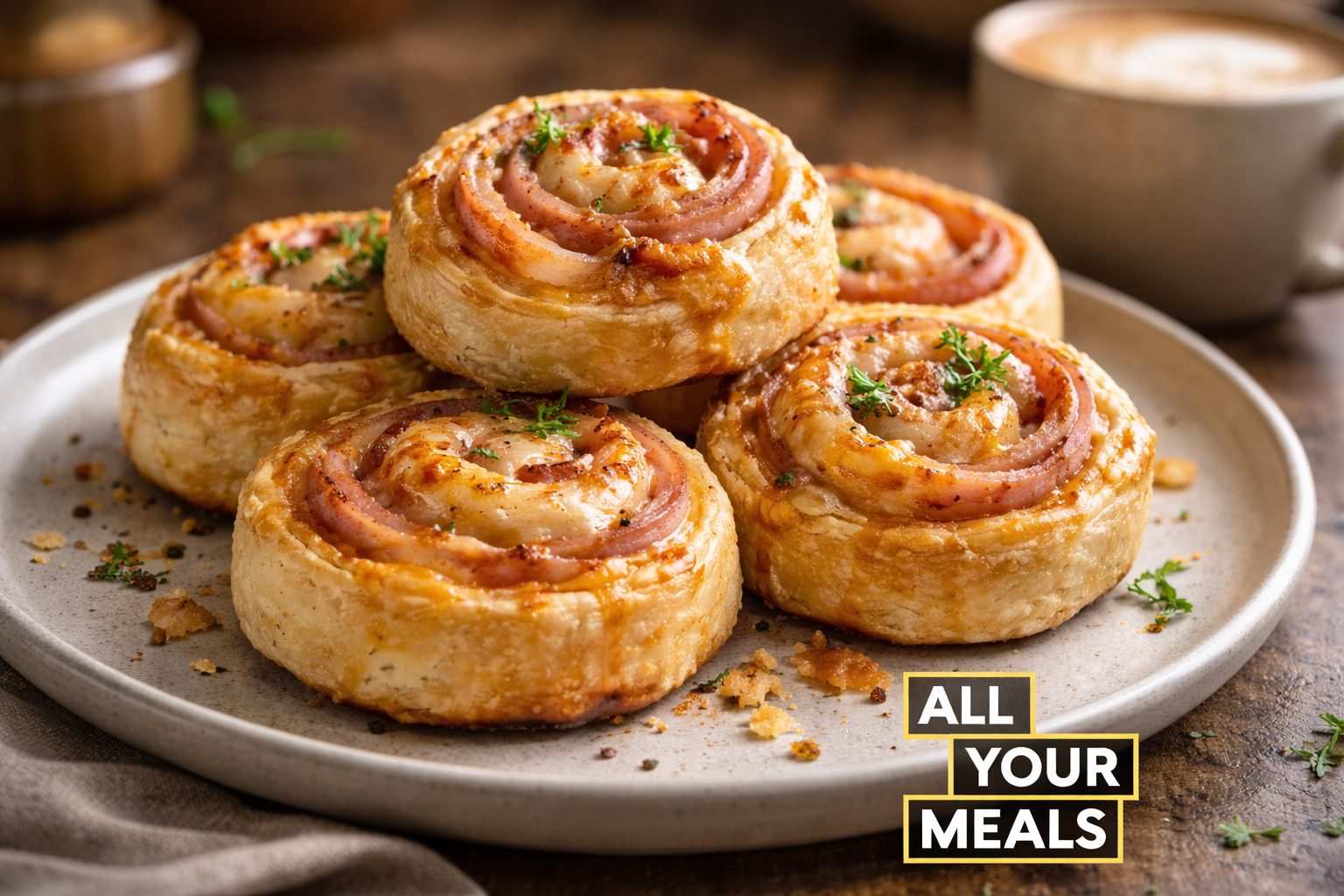 Ham, dijon mustard, cheese, and parsley rolled up in puff pastry