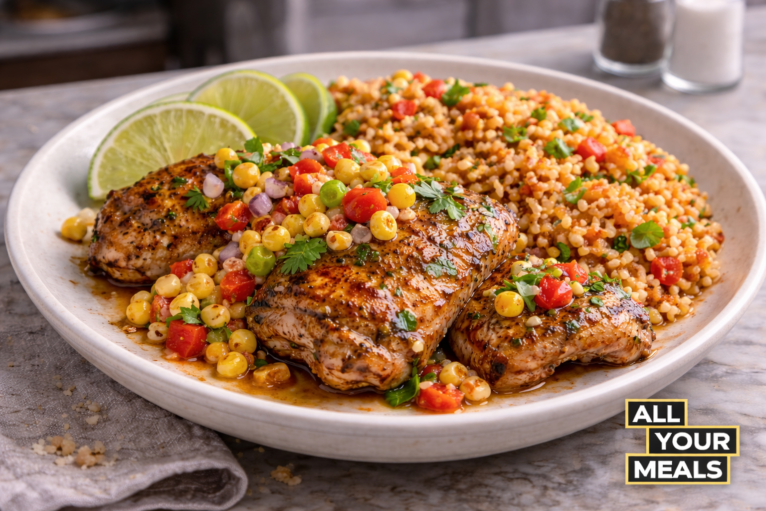 Cilantro lime marinated chicken thighs with Spanish cauliflower rice, and corn salsa
