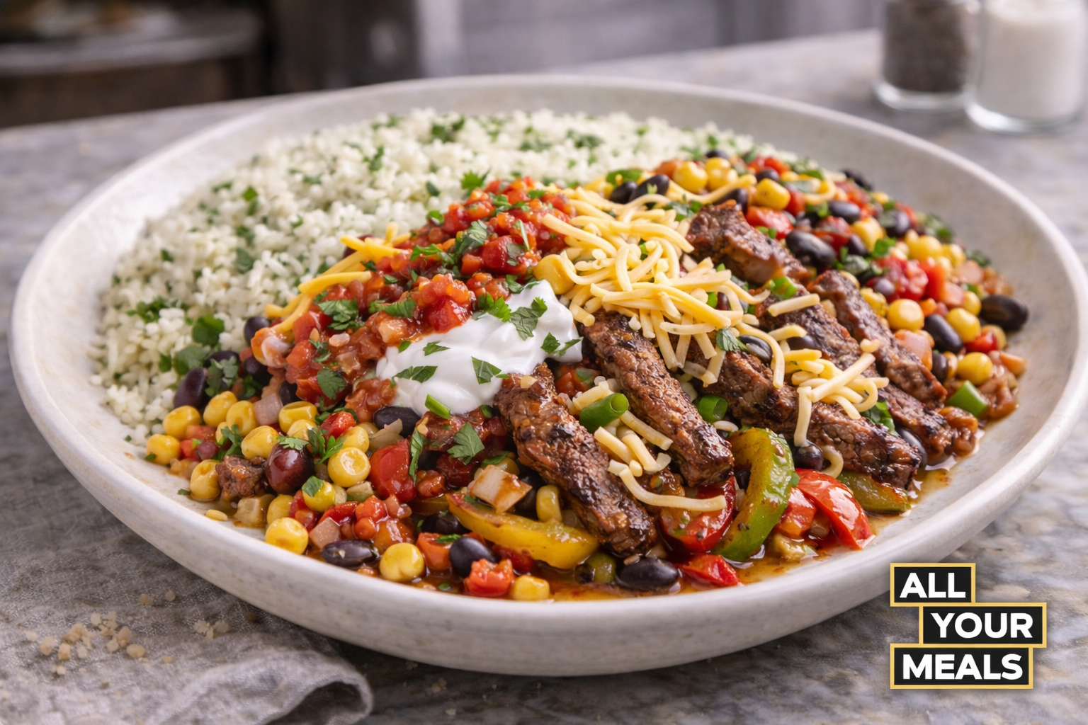 Fajita spiced beef with cilantro lime rice, onions, peppers, corn, and black beans. Served with salsa, sour cream and cheese