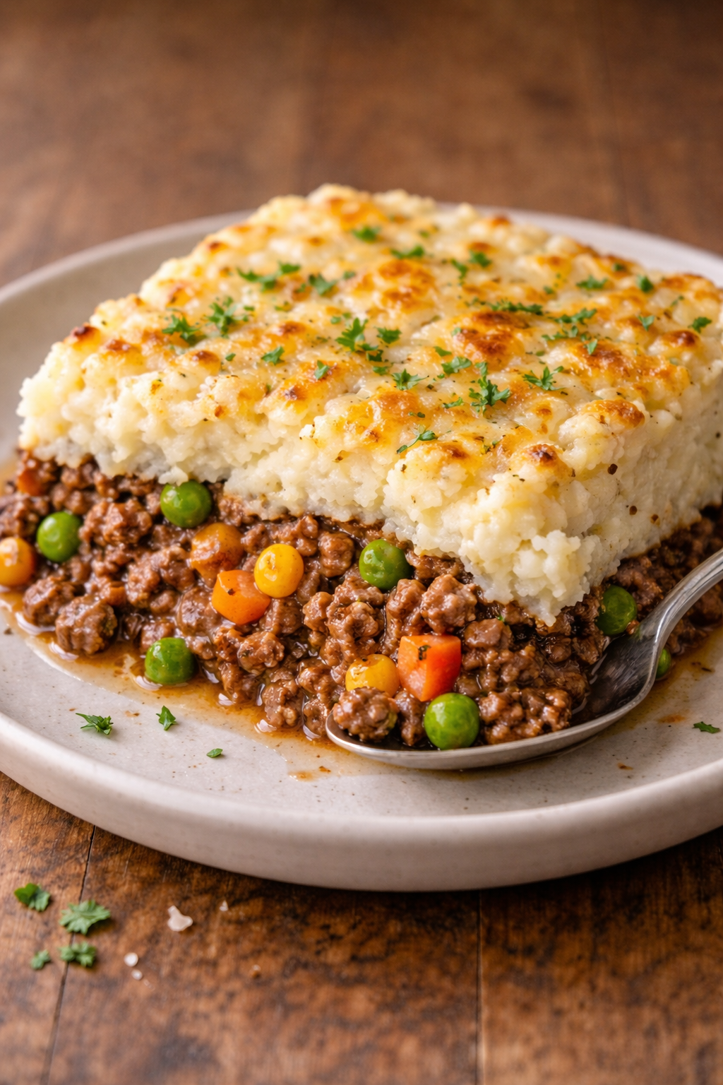 Seasoned ground beef with onion, carrots, peas, corn, and topped with cauliflower mash and cheese