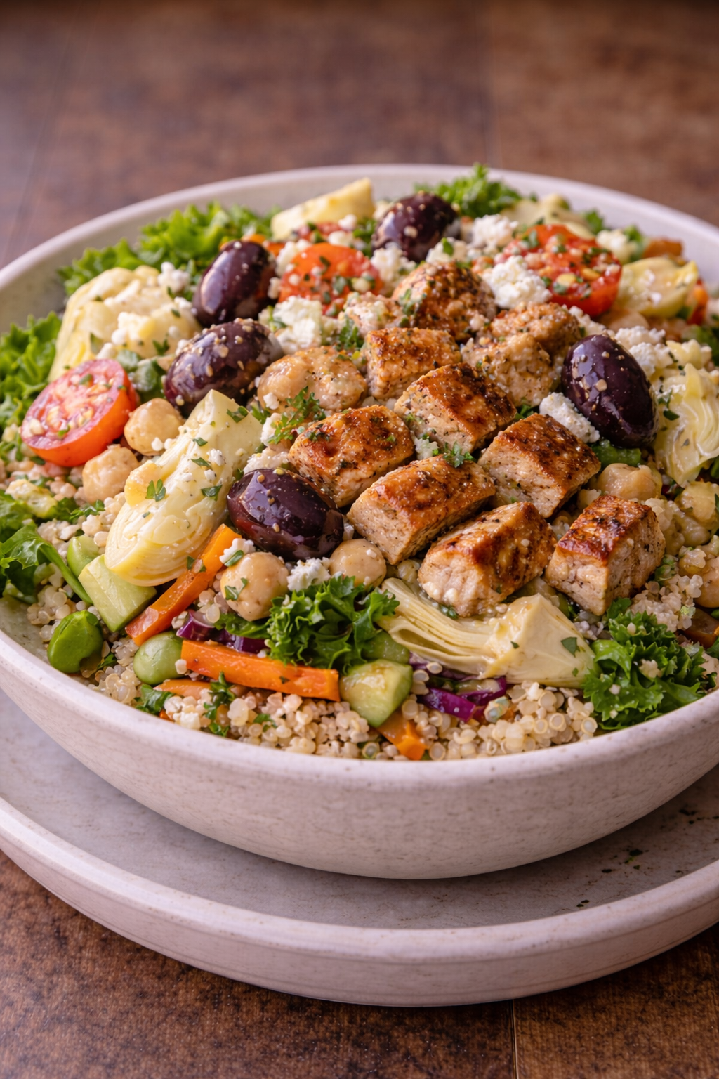 Fresh, balanced, and effortlessly refined. This bistro-inspired bowl combines fluffy quinoa with tender chickpeas, crisp lettuce, marinated artichokes, ripe tomatoes, and briny olives. Juicy, herb-seasoned chicken adds warmth and depth, grounding the dish with savory comfort.