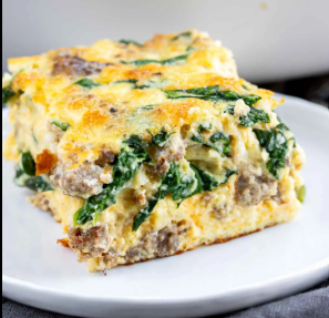 Breakfast frittata with breakfast sausage, onion, mushrooms, spinach and cheese