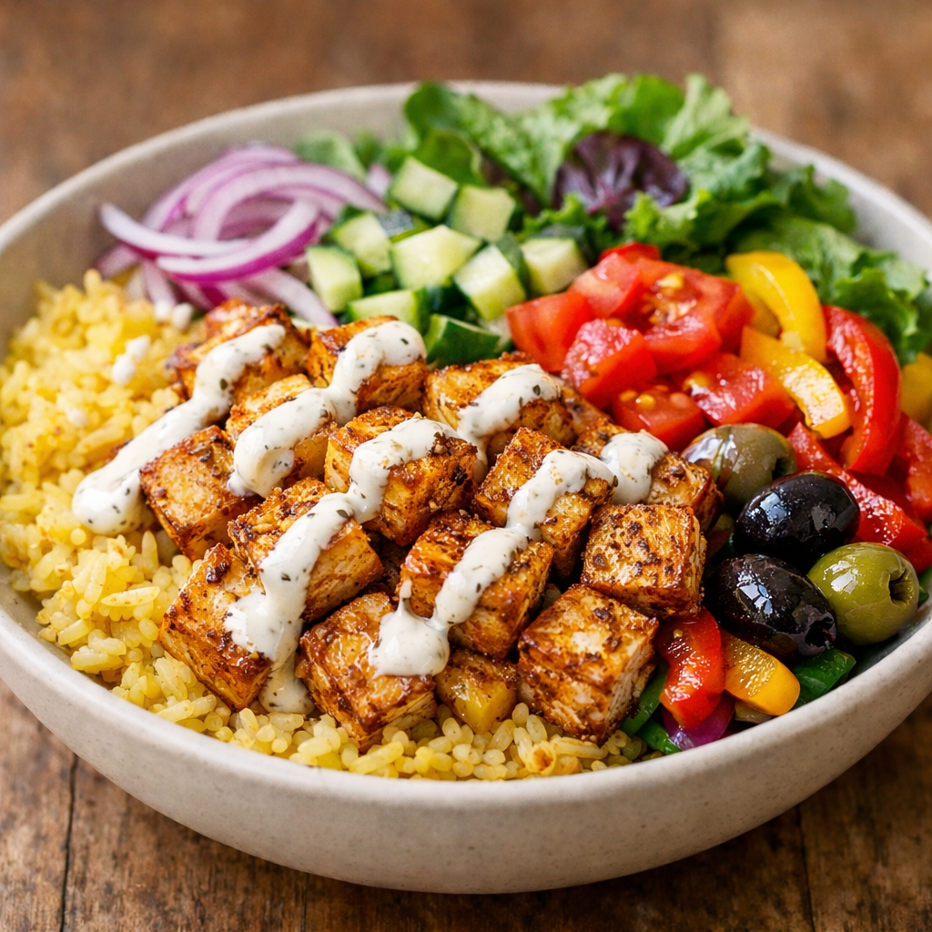 Shawarma inspired riced bowl with tofu, yellow rice, red onion, cucumber, mixed greens, peppers, tomatoes, olives and shawarma white sauce.